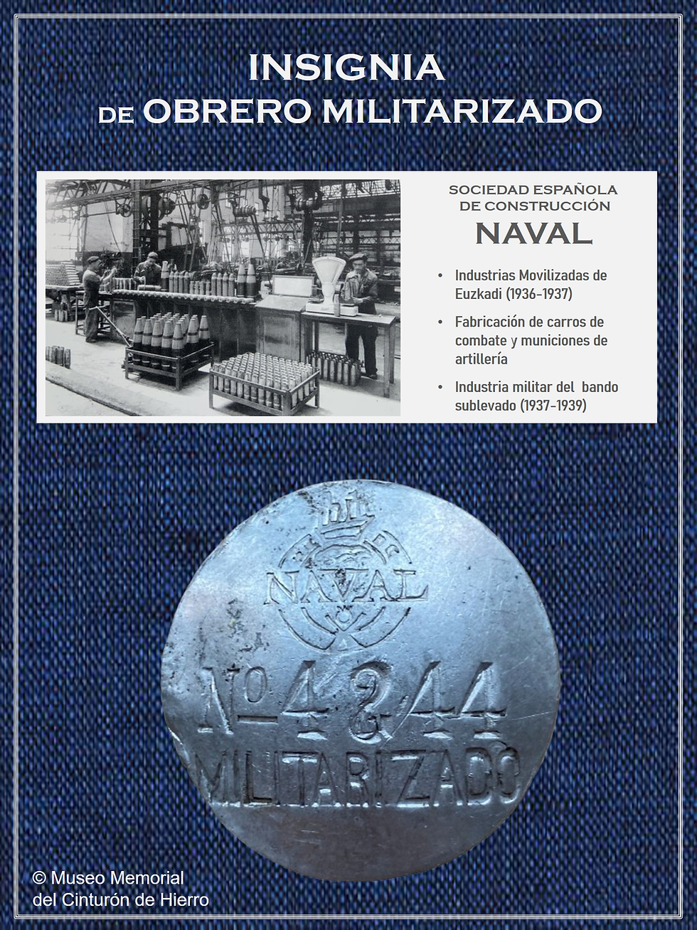 Esta CHAPA DE OBRERO MILITARIZADO ha llegado hasta nosotros de mano de nuestro amigo José Luis García Contreras y fue encontrada por su cuñado en los años 80 durante unas tareas de limpieza en una nave de la factoría. Desconocemos la fecha exacta de su empleo, preferentemente entre 1936 y 1939. Queremos agradecer desde aquí a José, con quien nos une el interés por la Historia desde hace cuatro décadas, su generosidad para que este emblema pueda ser contemplado por las personas que visiten el Museo Memorial del Cinturón de Hierro. ¡Muchas gracias!