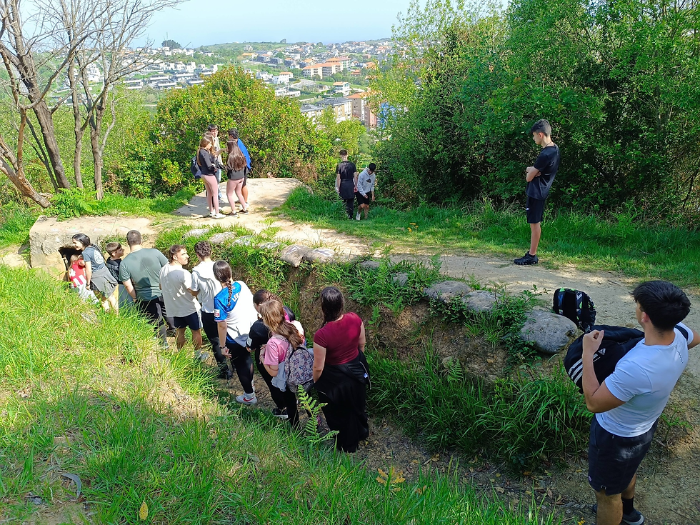 Hoy hemos recibido la visita de un grupo de IES Zorroza de Bilbao. Desde objetos, fotografías y mapas antiguos hemos ido conociendo la historia de Guerra Civil y el Cinturón de Hierro. Tras la vista en el museo hemos subido a Areneburu donde hemos tenido la oportunidad de conocer la importancia y estratégica ubicación de esta construcción defensiva.